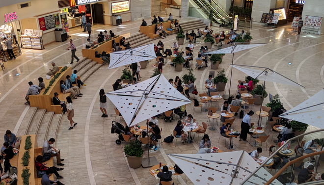 場所は、ゲートシティ大崎のB1、マクドナルドのあるフロアにあるフリーの座席がたくさんあるスペースです。